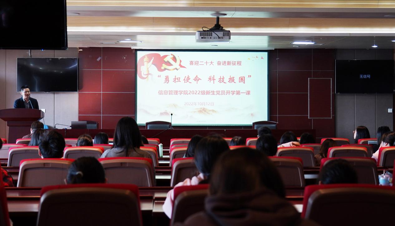 为迎接党的二十大胜利召开,引导党员进一步增强听党话跟党走的坚定信念。10月12日下午,信息管理学院党委以“勇担使命,科技报国”为主题,举办喜迎二十大主题党日活动。学院党委书记姜迎春、党委副书记刘千里、情报学教师党支部书记颜嘉麒、党委秘书、专职组织员朱敏与全体新生党员共同参加本次活动。活动由学院党委副书记刘千里主持。