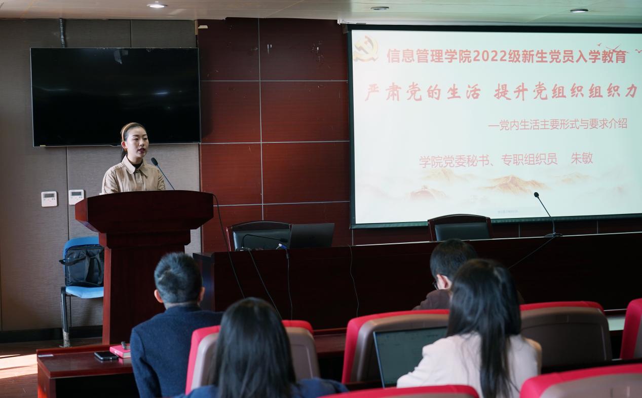 本次主题党日活动第一部分聚焦“如何做一名合格的党员”。党委秘书、专职组织员朱敏围绕《严肃党的组织生活,提升党组织组织力》主题发言。她首先对党内生活主要形式与要求展开介绍,然后强调新生党员要以思想为导向,认识上坚守组织性、行动上保持纪律性,积极参加党组织生活,巩固好党支部的战斗堡垒作用。