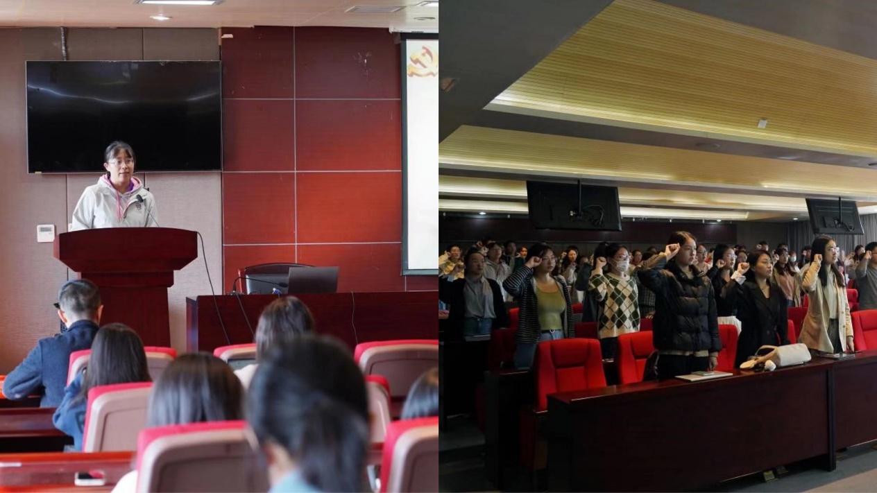 新生党员代表博士生任同宣读了《报效祖国 青年有责》——致南京大学信息管理学院全体同学的倡议书,倡议书强调青年党员应该立大志、明大德、成大才、担大任,把论文写在祖国大地上。随后,在新生党员代表硕士生李沅洁领誓下,全体党员重温入党誓词,立志永葆党性、矢志担当。