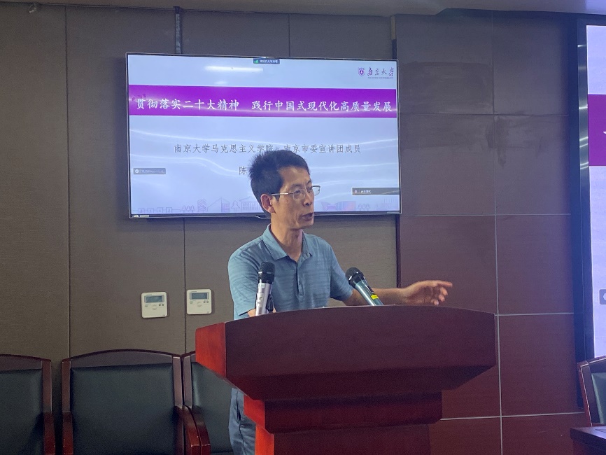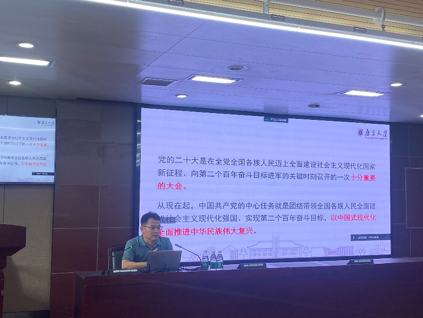 为深入学习贯彻习近平新时代中国特色社会主义思想和党的二十大精神,扎实推进学院分党校建设,6月13日下午,信息管理学院党委举办师生党员基本培训第一课,南京大学马克思主义学院副院长、南京市委宣讲团成员陈建以“贯彻落实二十大精神 践行中国式现代化高质量发展”为题作专题辅导报告。院党委书记马进军主持培训并作总结讲话。全院400多名师生党员参加培训。