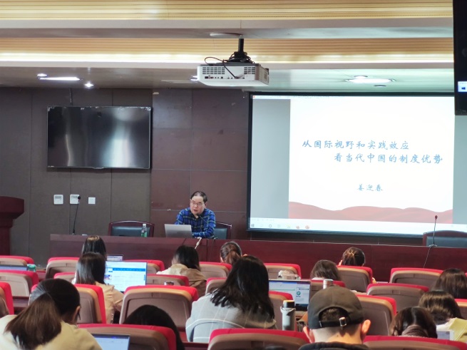 学院党委书记姜迎春教授以“从国际视野和实践效应看当代中国的制度优势”为题,深刻剖析科学把握社会问题的重要意义。面对国际形势风云变幻的背景,姜书记提出,年轻党员要学会科学把握社会问题,这有助于科学认识我国社会主义不断发展进步的奥秘,有助于科学认识党推动伟大斗争的聚焦点和着力点,有助于科学认识党领导国家参与全球化,推动全球治理等。他以盐城新四军纪念馆刘少奇同志的一篇文章“做一个好党员,建一个好的党”巧妙引出主题,认为重视对个体党员的教育活动是关乎党的整体建设的关键一招,要求党员对社会主义制度要有科学认识,坚定理想信念。