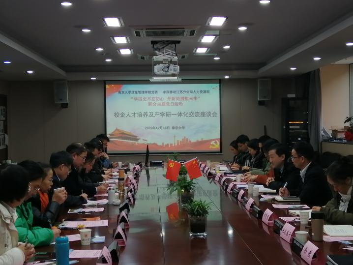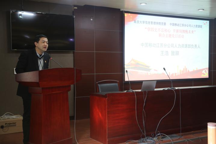 12月16日下午,由南京大学信息管理学院党委和中国移动江苏分公司人力资源部联合举办的“学四史不忘初心 开新局拥抱未来”主题党日活动在信管学院A410报告厅举行。学院党委书记姜迎春同志、中国移动江苏分公司人力资源部负责人王浩同志分别带领信管学院党员师生和移动嘉宾员工百余人参加联建共学系列活动。活动由学院党委副书记罗萍同志主持。