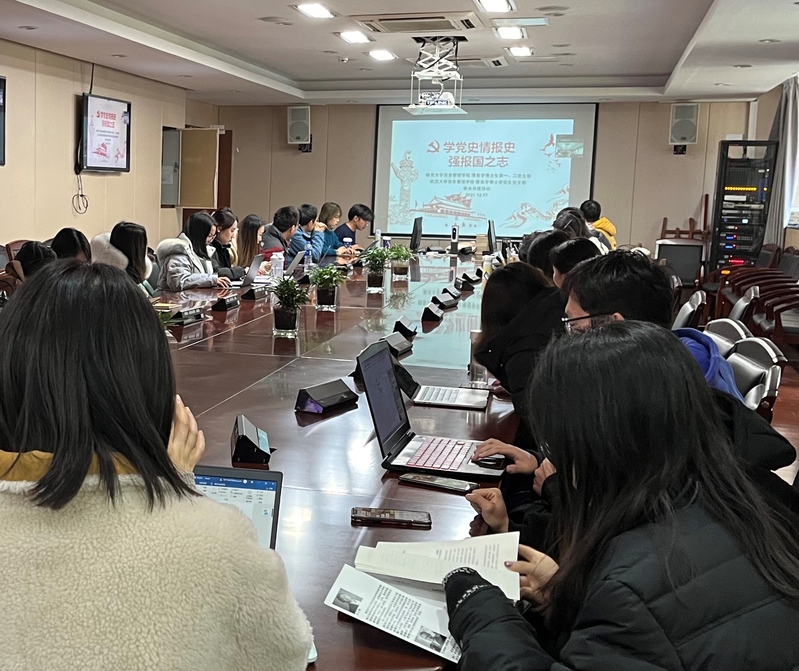 为加强情报学博士生党史学习教育工作,从情报学发展历史中汲取奋勇前行的智慧和力量,12月17日下午,南京大学信息管理学院情报学博士生第一、第二党支部联合武汉大学信息管理学院情报学博士研究生党支部举行共建活动。活动以线上线下相结合的方式展开,南大武大分设线下会场,活动主题为“学党史情报史,强报国之志”。南京大学信息管理学院副院长朱庆华教授,武汉大学信息管理学院陆泉教授,各支部党员以线上线下相结合的方式参会。与会师生将党史学习与情报史学习相结合,将党史教育与知识竞赛相融合,做到既丰富党史学习教育模式,亦促进院系间博士生专业交流。活动由南大信管情报学博士生第一党支部书记范涛、第二党支部书记孔嘉和武大信管情报学博士研究生党支部书记吴乐艳同志主持。