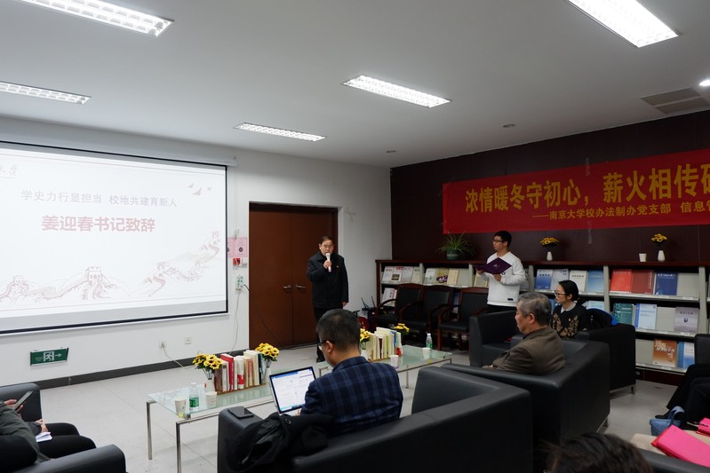 回望奋斗征程,传承红色基因,坚守入党初心,践行为民宗旨。12月23日下午,南京大学机关党委校办法制办党支部、信息管理学院党委“浓情暖冬守初心,薪火相传砥砺行”联合主题党日活动在信管学院红色经典悦读角举行。南京大学校长办公室、法制办公室主任杭祝洪,信管学院党委书记姜迎春及双方师生代表40余人参加活动。