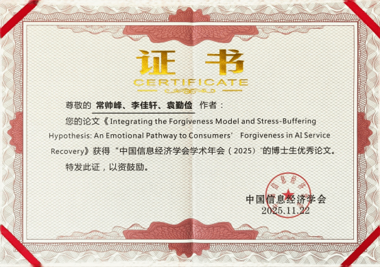 2024级博士研究生常帅峰、李佳轩(导师:袁勤俭教授)提交的论文《Integrating the Forgiveness Model and Stress-Buffering Hypothesis: An Emotional Pathway to Consumers’ Forgiveness in AI Service Recovery》凭借其在人工智能服务恢复、情绪机制建构与跨理论整合方面的研究成果,从众多高质量研究中脱颖而出,成功获评“中国信息经济学会学术年会(2025) ”博士生论坛优秀论文奖。