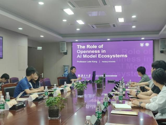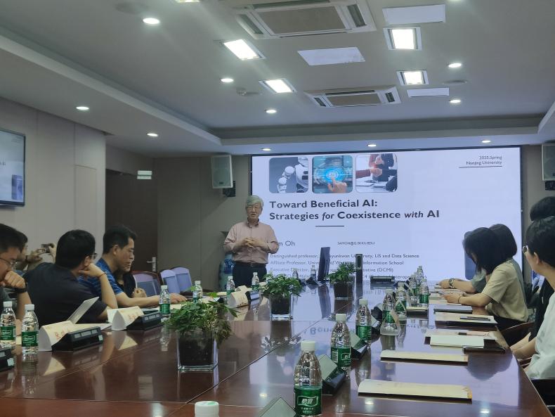 在主旨报告环节中,韩国成均馆大学资深教授Sam Oh做题为人机共生时代:以人为本的人工智能共存策略(Towards Beneficial AI: Strategies for Coexistence with Human-Centered AI)的分享,本次报告深入探讨了人工智能(AI)时代人类与AI共存的策略,以及教育在这一过程中的关键作用。Sam Oh教授指出,人类历史是信息发展的历史,而AI的出现是人类在信息积累和处理技术发展过程中的重要里程碑。Sam Oh教授认为AI的发展应当服务于使“人类生活得更好”,并强调人类的选择和决策将塑造未来的方向。此外,Sam Oh教授在报告中还提到了AI时代教育转型的必要性,强调信息素养、数据素养和AI素养在教育中的重要性。本次报告也为南京大学师生及教育工作者提供了关于AI与人类共存的深刻见解和重要指导。随后,南京大学信息管理学院教授、副院长康乐乐做题为开放机制在AI模型生态系统中的赋能作用(The Role of Openness in AI Model Ecosystems),深入探讨了开放与封闭创新模式对AI发展的影响,以及大型语言模型(LLMs)对知识交流的深远意义。