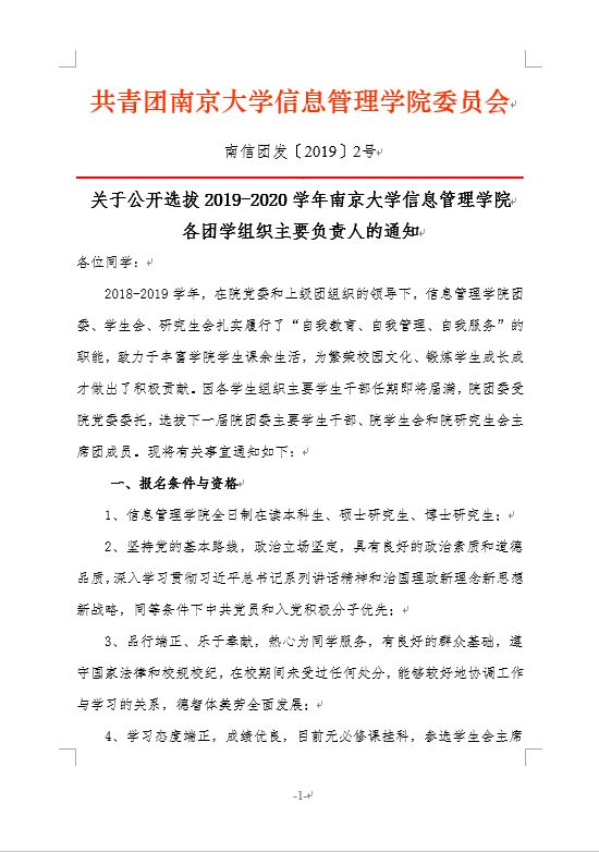 关于公开选拔2019-2020学年南京大学信息管理学院 各团学组织主要负责人的通知