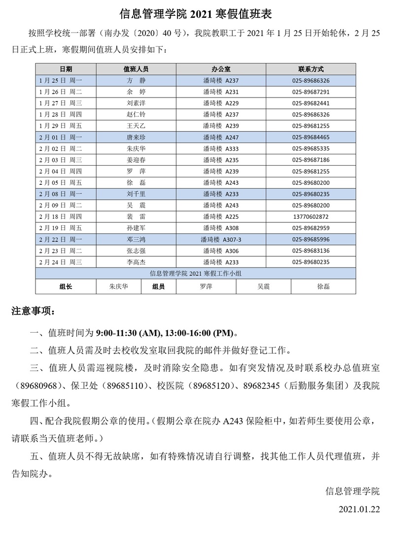 信息管理学院2021寒假值班计划