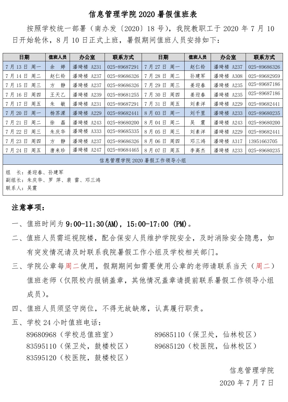信息管理学院 2020 年暑假值班计划