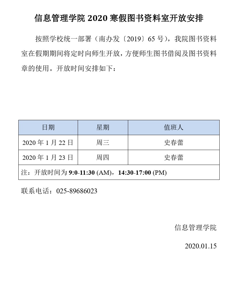 信息管理学院2020寒假图书资料室开放安排