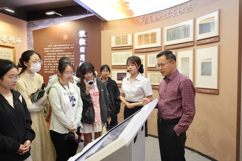 步入专题展厅,《书信家国 尺牍情深——弘扬伟大建党精神长三角档案联展》以大量珍贵家书为脉络,生动展现共产党人的初心使命。泛黄的信笺、朴实的字句让同学们驻足沉思,感受红色文化的力量与魅力。而《只要西藏人民需要——江苏早期援藏口述史料展》则通过口述档案展陈,再现上世纪江苏援藏干部不畏艰险困苦、不怕山高水长,扎根雪域,用青春和汗水为西藏繁荣发展贡献江苏力量的光辉历程的事迹。刘鸿浩在讲解中特别强调当代档案人记录时代印记的责任担当,对同学们给予殷切期望。