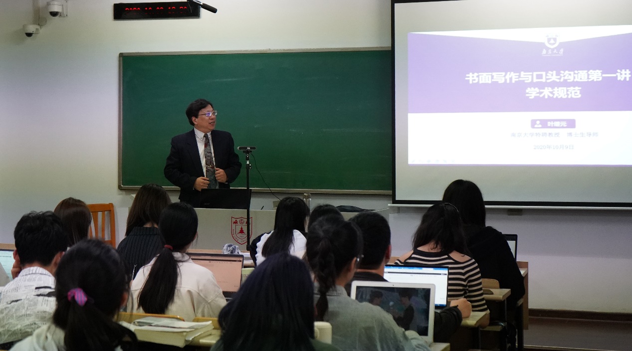 本课程的第一讲由南京大学特聘教授、信息管理学院博士生导师叶继元教授负责。叶继元教授围绕何为学术规范、何为基本规范、基本规范对学术写作的指导作用三个问题,深入浅出、辅以生动案例向五所高校本科生讲授了相关知识。叶继元教授指出:“学术规范不仅仅是科学实验或论文写作中的数据真实、不抄袭、
