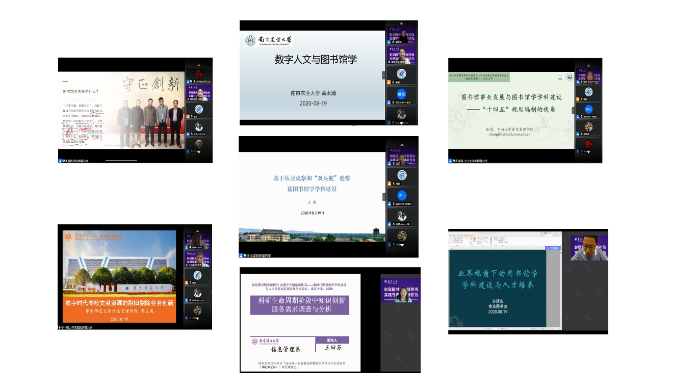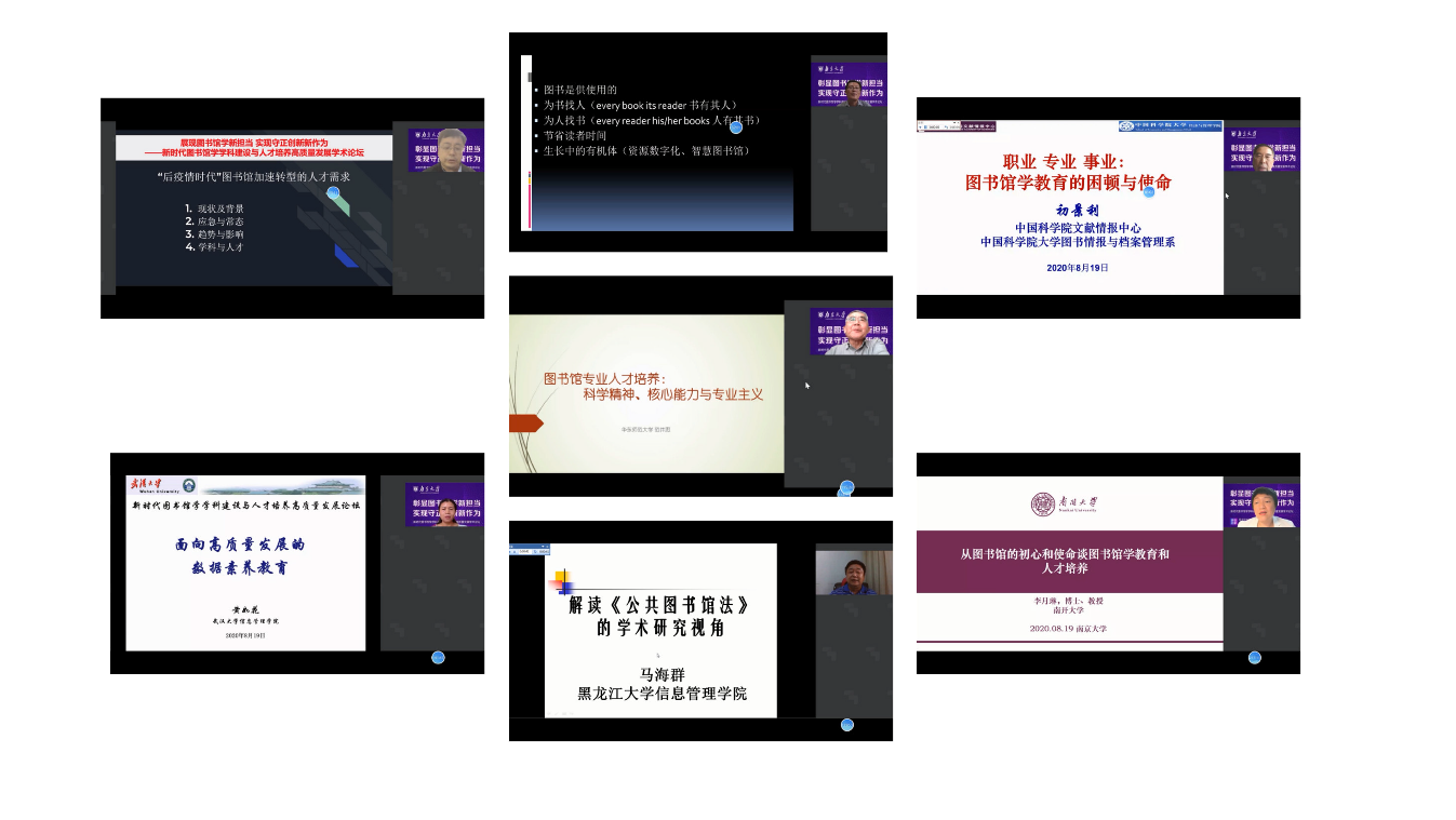 2020年8月19日,由南京大学信息管理学院主办的“新时代图书馆学学科建设与人才培养高质量发展”学术论坛成功召开。论坛邀请了来自北京大学、武汉大学、南京大学、中国人民大学、中山大学等多所高校,国家图书馆、上海图书馆、南京图书馆等公共图书馆的三十余名专家学者,以及图书馆学相关学术期刊代表,共同就新时代图书馆学学科建设与人才培养进行专题报告与研讨,吸引了780余名专家学者、业界人士和研究生线上参会。