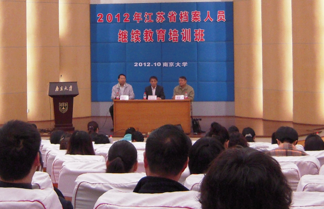 近日,在南京大学逸夫馆报告厅,举办首期江苏省档案人员继续教育培训班,来自省交通、卫生、广电、教育、农林、水利、电力、金融、监狱等部门200多名档案人员参加了培训。前不久,南京大学与江苏省档案局(馆)共同签署了战略合作框架协议,根据协议,南京大学信息管理学院确定为“江苏省档案人员继续教育基地”,本期江苏省档案人员继续教育培训班顺利开班,是继举办“档案学硕士研究生课程进修班”后,双方执行协议的又一切实措施。