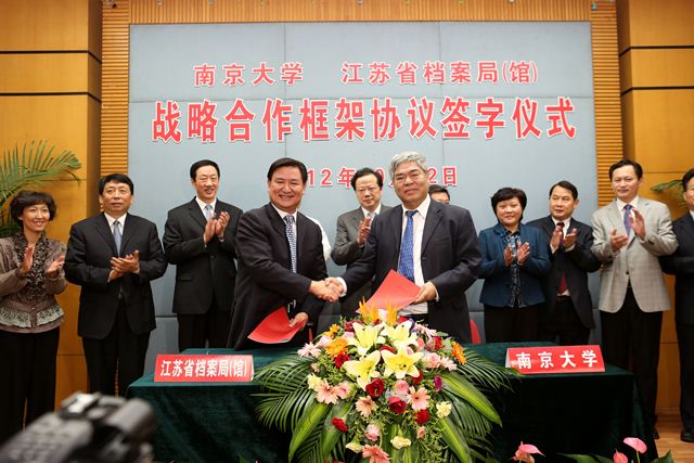 10月22日,南京大学与江苏省档案局(馆)签署战略合作框架协议。省档案局(馆)长党组书记、局(馆)长谢波及相关负责人,南京大学党委书记洪银兴、党委副书记朱庆葆,信息管理学院院长孙建军,以及校办、档案馆、历史系、校团委、社科处等院系部处负责人和师生代表出席仪式。仪式由校党委常委、党办主任邹亚军主持。