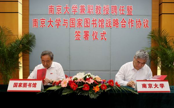 5月11日上午,国家图书馆馆长(副部长级),文化部原副部长,中国图书馆学会名誉理事长,第十一届全国政协委员周和平同志受聘为南京大学兼职教授,并与南京大学签署了战略合作协议。南京大学党委书记洪银兴教授、南京大学副校长杨忠教授出席仪式并讲话。仪式在南京大学鼓楼校区知行楼志新厅举行,由南京大学信息管理学院院长孙建军教授主持。出席仪式的领导和嘉宾还有江苏省文化厅党组成员、南京图书馆党委书记方标军研究员,南京大学图书馆馆长洪修平教授,国家图书馆人事处王青云处长,国家图书馆研究院申晓娟副院长等。
