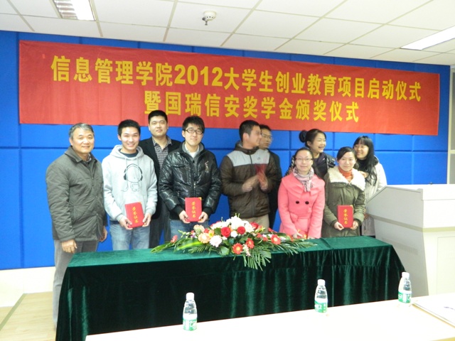 3月15日下午,信息管理学院(南京大学国家保密学院)2012年度大学生创业教育项目启动仪式暨国瑞信安奖学金颁奖仪式在逸夫管理科学楼举行。江苏国瑞信安科技有限公司副总经理唐卫民、公司研究院副院长冷静及校就业创业指导中心职业发展部部长刘颖应邀出席活动。在场的学院领导和老师还有南京大学国家保密学院常务副院长沈固朝,信息管理学院副院长陈雅,党委副书记罗萍等。