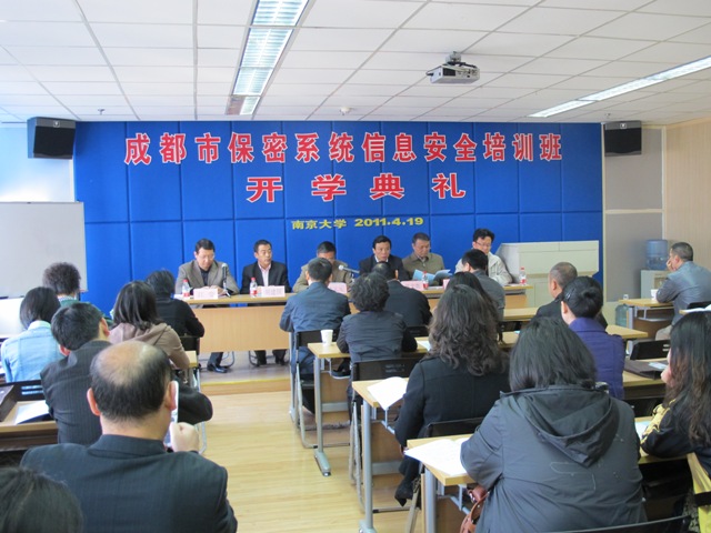 日上午,成都市保密系统信息安全培训班开学典礼在逸夫馆理科学楼举行。南京大学全国干部教育培训基地办公室主任、继续教育学院院长凌元元、南京大学信息管理系主任孙建军、南京大学国家保密学院常务副院长沈固朝,成都市保密局局长张文贵,成都市保密局副巡视员胡建国等出息了仪式。仪式由信息管理系党委书记江莹主持。