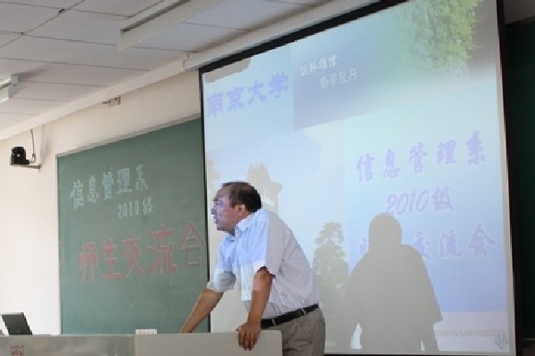 孙建军主任首先向2010级新同学介绍了南京大学信息管理系的发展历程、学科发展、师资队伍、人才培养、教学环境等方面的情况,而后提出了对新同学大学学习生活的期待——DIY(Do it yourself),具体分解为自我剖析、自我设计、自我体验、自我负责四个阶段,并衷心祝愿新同学通过这四个阶段的自我塑造成长为“具有国际化视野,善于多元化交流,人格完善、专业精通的优秀人才”。江莹书记建议新同学不仅要在南大求知、求学,也要学会做人、做事,应该发扬中国传统文化中的优良品德,心存感恩和责任,待学有所成后不忘回馈奉献。同时江书记向同学们保证学校和院系一定尽力为大家的成长和发展提供良好的条件。吴建华副主任为新同学剖析了中学和大学的区别,强调了自我管理能力在大学学习生活中的重要性,并对大家提出了四点要求“定位准确、主动接轨、注重能力、发展多元”。戴咏梅副书记承接吴建华副主任的主题进一步分析了大学学习生活的特点,希望新同学认真思考大学阶段的奋斗目标并敢于展示自我。