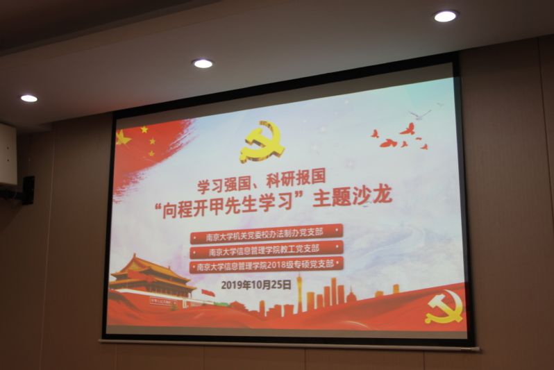 为贯彻落实《中共南京大学委员会关于开展“不忘初心、牢记使命”主题教育的实施方案》,积极开展学习程开甲、学习党史与新中国史活动,坚定党员师生学习强国、科研报国的理想信念,10月25日下午,机关党委校办法制办党支部与信息管理学院党委教工党支部、2018级专硕党支部共同举办“学习强国  科研报国——向程开甲先生学习”主题活动。校长助理陈建群、信息管理学院院长孙建军与三个支部的党员师生济济一堂,共同参加学习活动。活动由信息管理学院党委书记姜迎春主持。