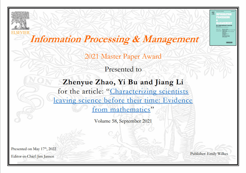 硕士研究生赵镇岳作为第一作者的论文“Characterizing scientists leaving science before their time: Evidence from mathematics”获得期刊Information Processing & Management颁发的2021年度Master Paper Award(最佳硕士生论文奖)。该论文通讯作者为91暗网